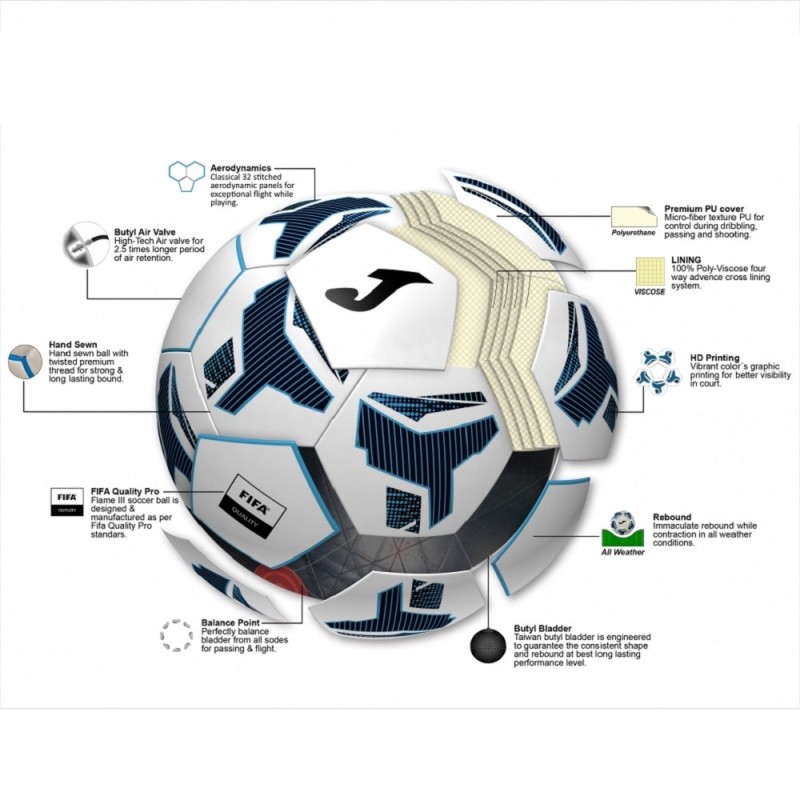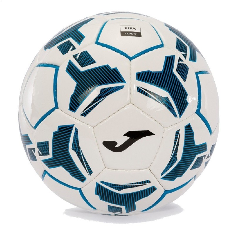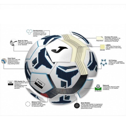 Este modelo de Joma posee características excepcionales que lo convierten prácticamente en un balón perfecto. Se trata de un balón con 32 paneles diseñados para lograr una aerodinámica impecable cuando no está en contacto con el suelo. Además, está fabricado con material de alta calidad, PU premium, lo que le otorga un control perfecto al realizar disparos, pases o regates. También cuenta con una cámara interior de butilo y una válvula que permiten que mantenga el aire hasta 2,5 veces más tiempo que otros balones. Cumple con los rigurosos estándares de calidad de la FIFA (FIFA Quality Pro) y cuenta con una vejiga perfectamente equilibrada desde todos los lados, lo que garantiza una trayectoria y un rebote perfectos en cualquier condición climática. Además, ha sido cosido a mano con gran atención a la calidad y presenta un diseño vistoso y colorido que combina diferentes tonos de azul y blanco.