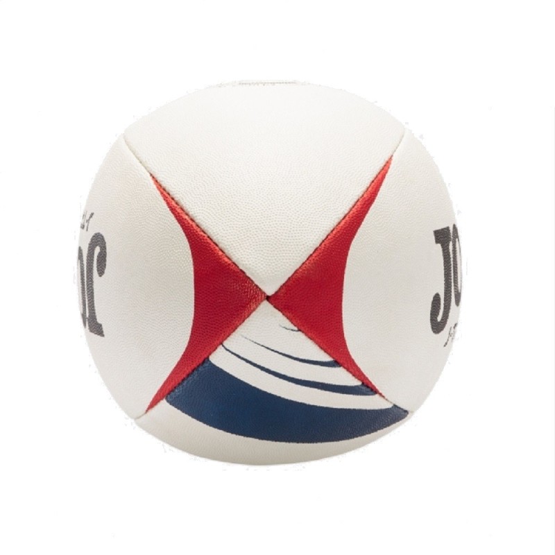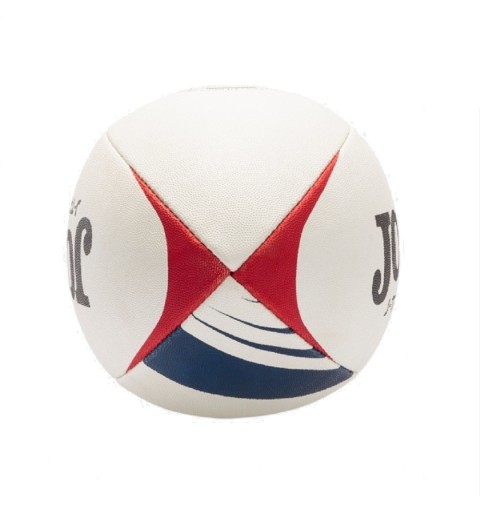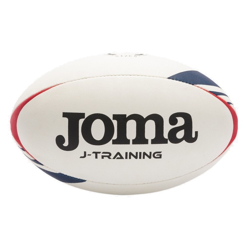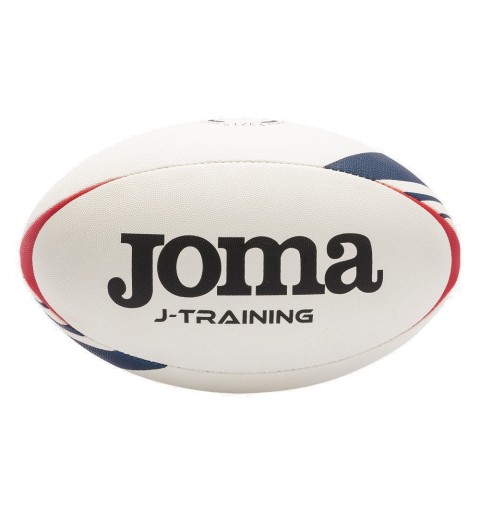 El balón de rugby tiene un diseño moderno en color blanco con detalles en color rojo y azul marino. Perfecciona tus pases y lanzamientos con J-Training de Joma.