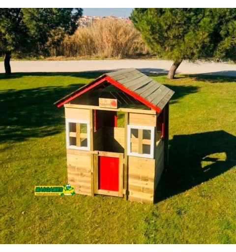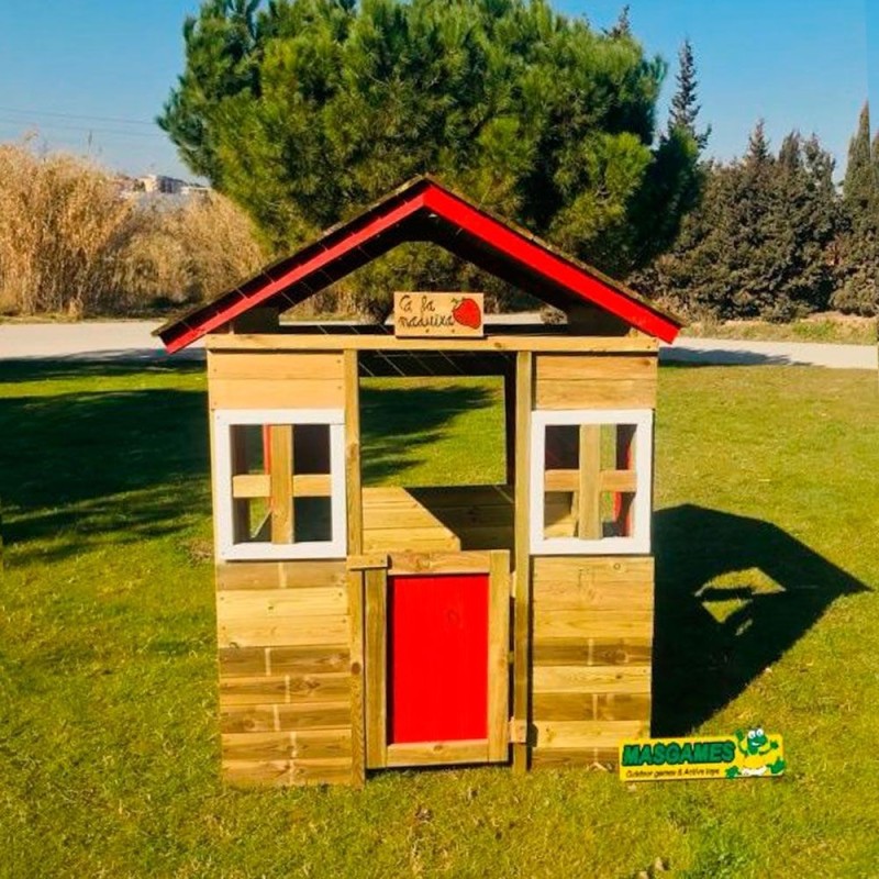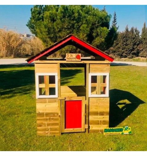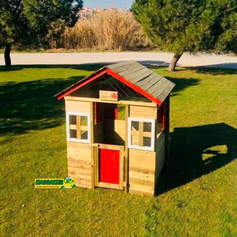 Casita para niños modelo Fresita XL, fabricada en madera con tratamiento para exteriores. Cuenta con un techo a dos aguas y un amplio frontón abierto.