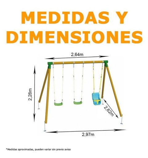 El columpio Etna triple de madera incluye dos asientos individuales con base de plástico y un asiento para bebé, permitiendo que los más pequeños de la casa también se diviertan. Ideal para ofrecer entretenimiento seguro a toda la familia.