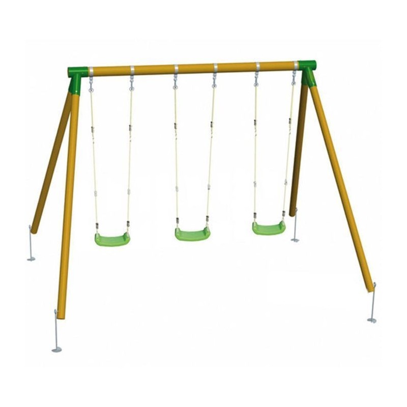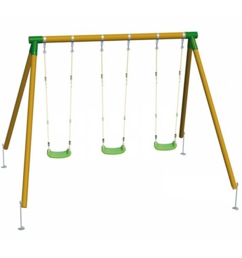 El columpio Etna triple de madera está equipado con tres asientos de plástico ajustables en altura y un sistema de anclaje para fijarlo al suelo del jardín.