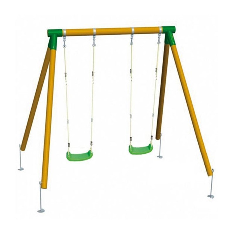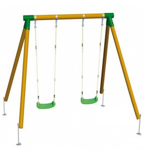 El columpio infantil Kibo doble de madera está diseñado con dos asientos de plástico verde, ideal para que los niños se diviertan en el jardín. Perfecto para disfrutar de horas de juego al aire libre.