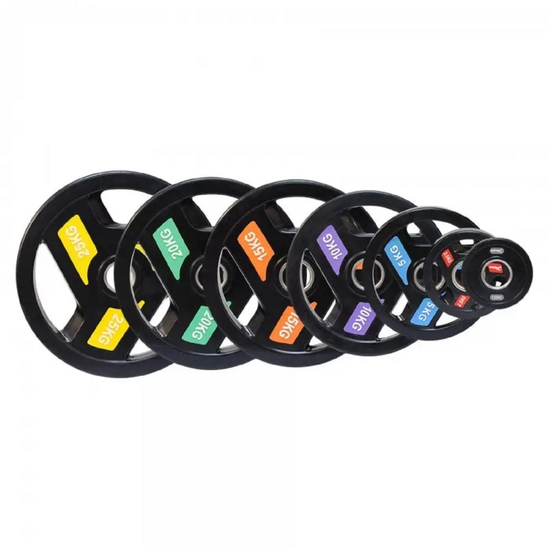 Discos olímpicos de diferentes pesos con agarres y casquillos metálicos, compatibles con barras de 50 mm e ideales para entrenamientos de fuerza.