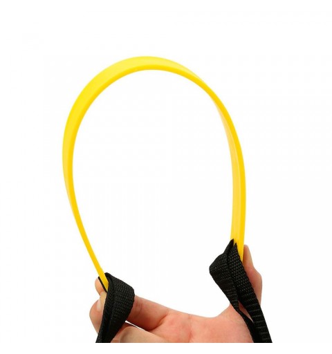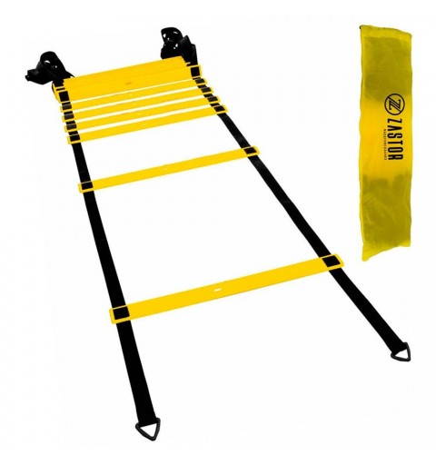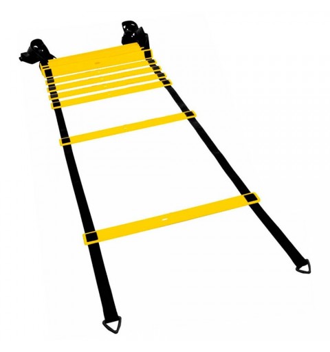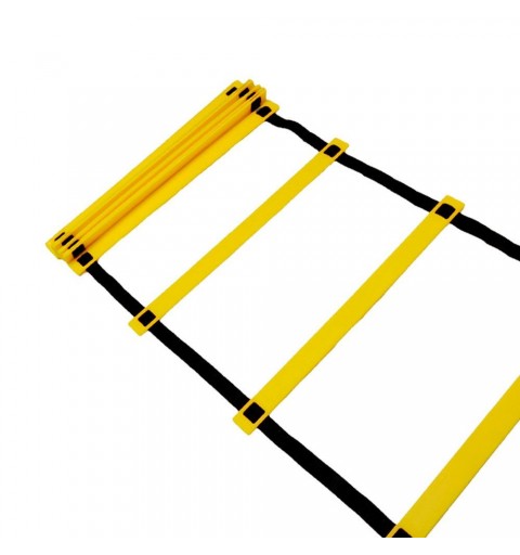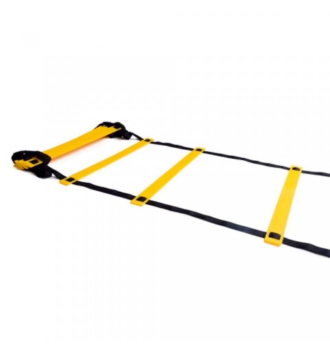 Esta escalera está compuesta por dos correas de tela de nylon y peldaños de plástico planos con 41cm de ancho y de gran visibilidad en color amarillo flúor. Tiene 6 metros de longitud total, pero los peldaños son ajustables y flexibles para poder colocarlos a la distancia deseada por cada jugador y así conseguir peldaños más anchos o más estrechos y variar la intensidad del ejercicio. Los listones planos, flexibles y de gran visibilidad hacen que los ejercicios sean más fáciles de realizar y que no molesten en los movimientos de los pies.