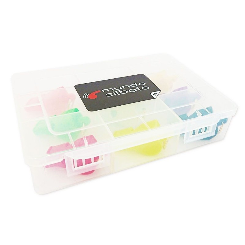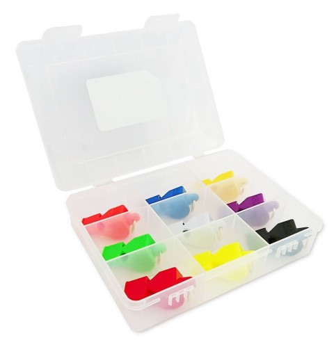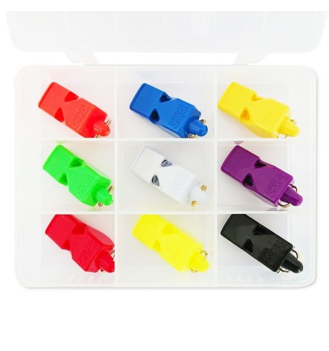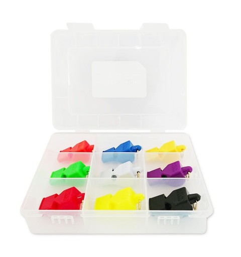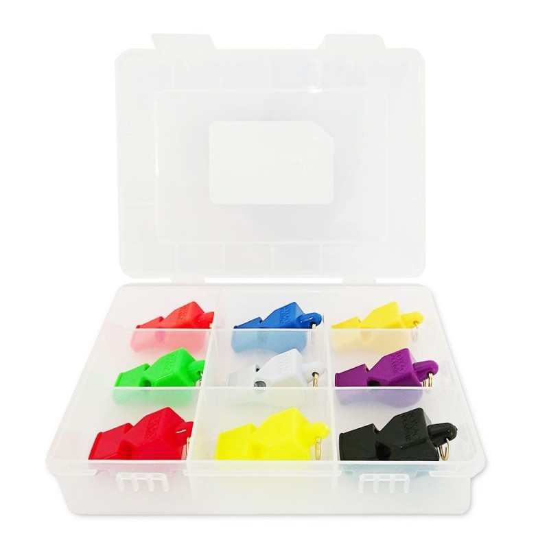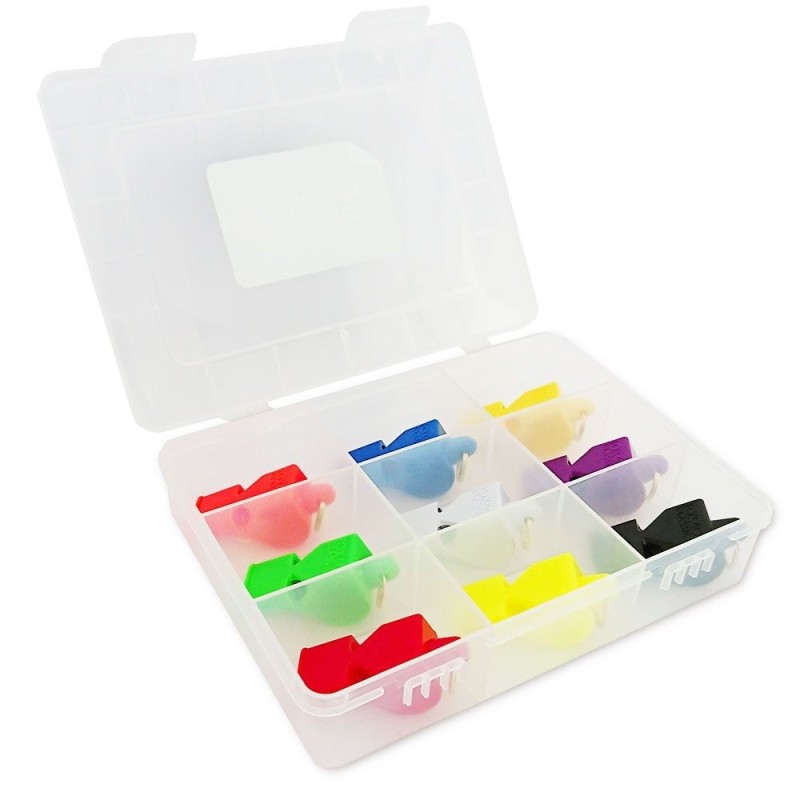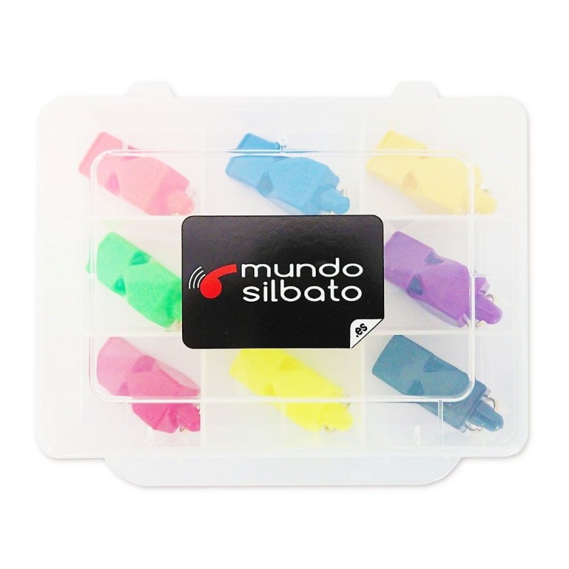 Estuche transparente con capacidad para guardar un total de 9 silbatos. Cierre seguro con doble pestaña. Apertura amplia para cómodo acceso al interior. No incluye silbatos.
