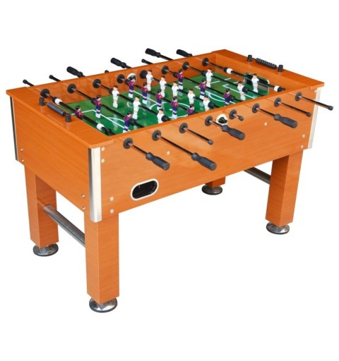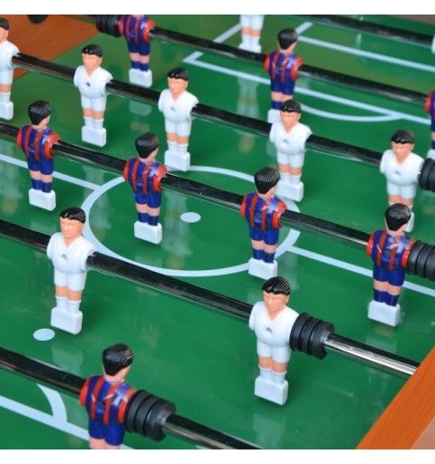 Este futbolín es ideal para jóvenes y adultos, con un tamaño perfecto para que todos lo disfruten. Te garantiza horas de diversión y será la envidia de tus conocidos. Está compuesto por 22 jugadores, 11 con uniforme blanco y 11 con uniforme azul y granate, montados en varillas metálicas con mangos de plástico para mayor comodidad. Incluye retorno de bolas, copas laterales para iniciar el juego y 2 marcadores manuales. Fabricado con cantoneras reforzadas y porterías con travesaños cromados, también cuenta con niveladores de pata para ajustar el futbolín Premier. Recomendado para mayores de 14 años.