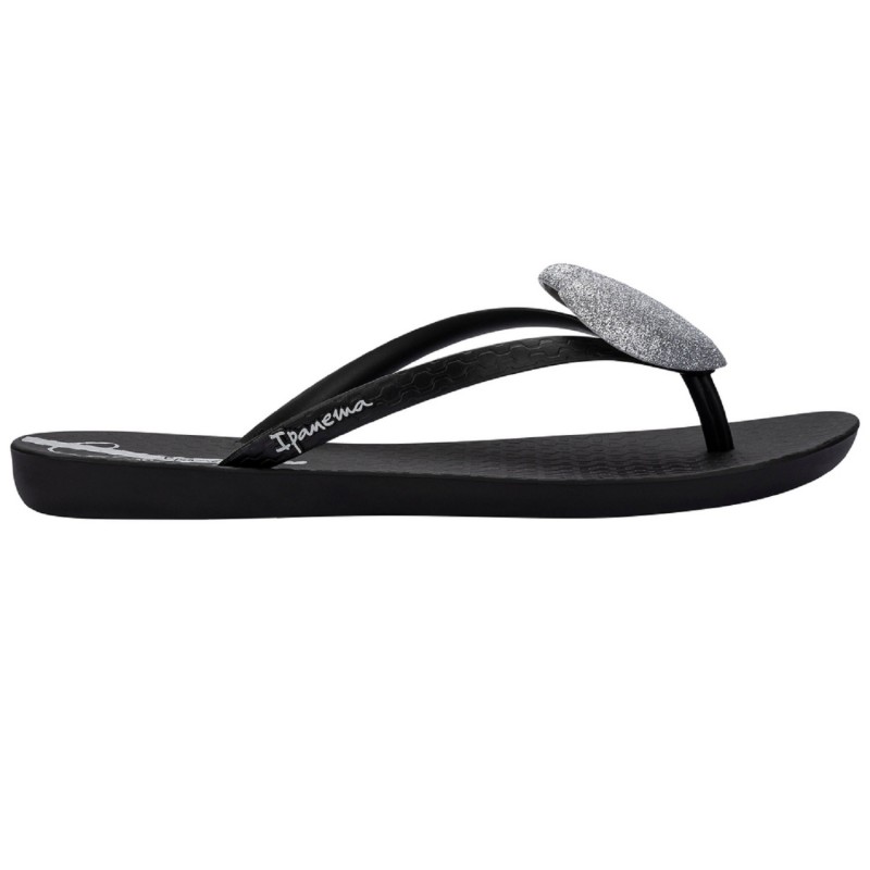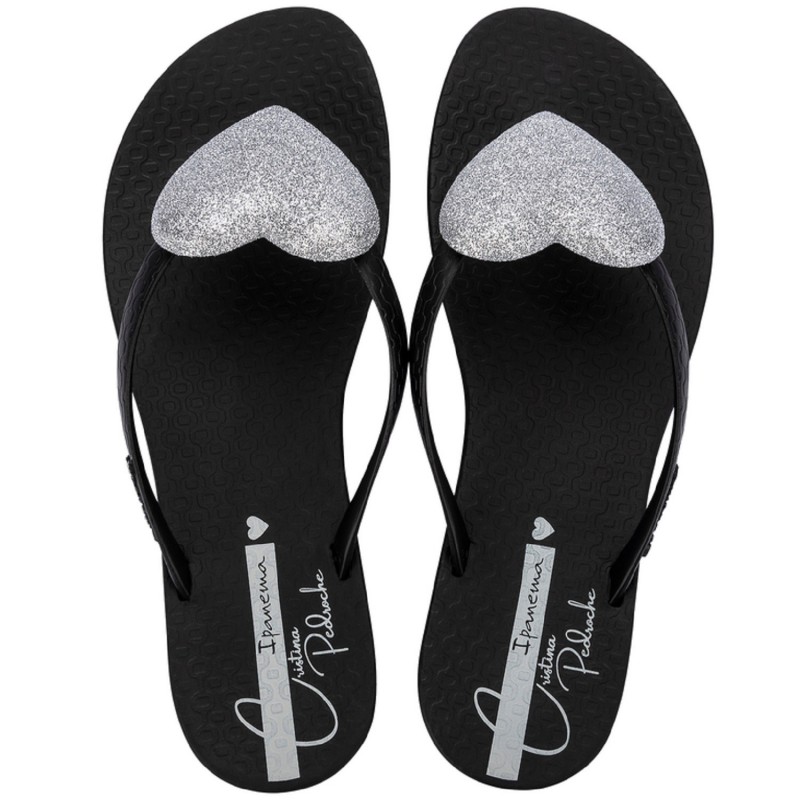 Sandalias Ipanema Cristina Pedroche Fem en negro con corazón de purpurina color plata para mujer, combinando diseño versátil, comodidad y un acabado elegante para looks de verano.