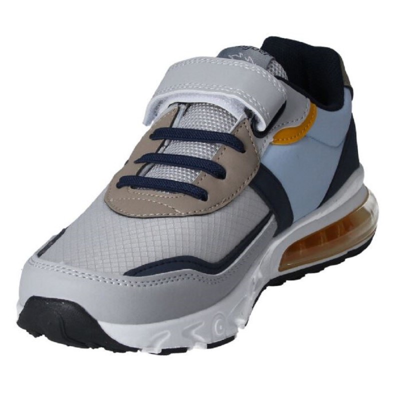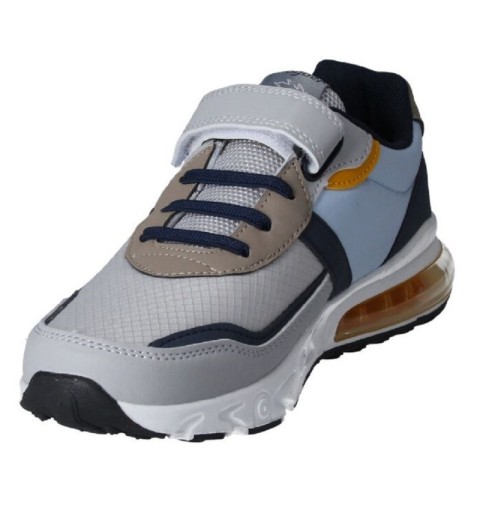Zapatillas para junior en color gris con detalles en azul marino y con cámara de aire en la suela para ofrecer una mayor comodidad a la hora de utilizarla. El cierre de velcro con tiras elásticas en el empeine hace que sea muy sencilla de poner y quitar y su diseño hará que luzcan con estilo y comodidad.