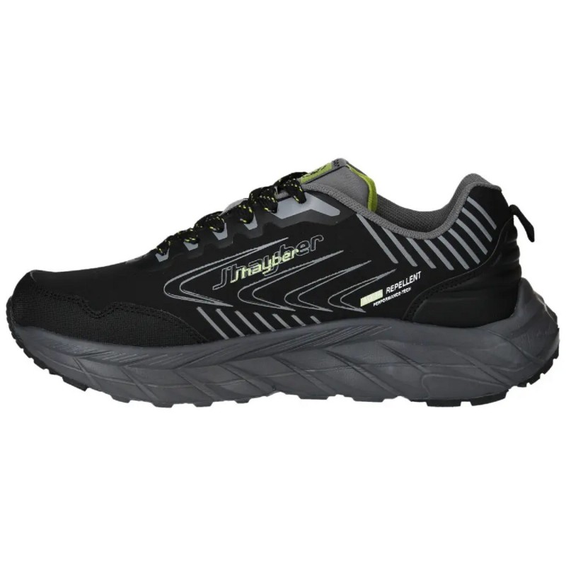 La J’Hayber Rasola Black está desarrollada con un enfoque técnico que prioriza el rendimiento en montaña. La estructura de su suela ofrece una tracción firme en superficies desiguales, con un diseño que absorbe impactos y estabiliza la pisada. La membrana Aqua Repellent asegura una protección eficaz frente a la humedad sin perder capacidad de transpiración, garantizando confort prolongado durante las rutas más largas. Sus refuerzos en puntera y talón refuerzan la seguridad frente a golpes o fricción constante.