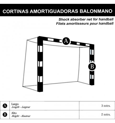 Juego de 2 cortinas amortiguadoras para porterías de balonmano Pro, elaboradas en polipropileno de alta resistencia de 5mm con malla de 100mm, diseñadas para absorber el impacto del balón y proteger las redes principales. Ideales para entrenamientos y competiciones, estas cortinas garantizan durabilidad, seguridad y rendimiento profesional. Redes no incluidas.