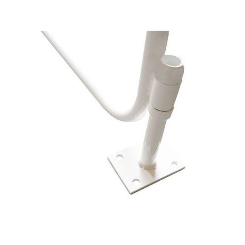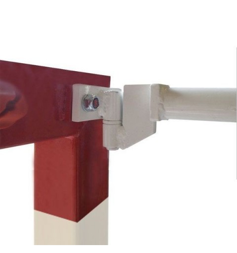 Cada portería esta compuesta por marco de aluminio (postes y larguero) en rojo/blanco, arquillos de acero de 33 mm abatibles lateralmente a ambos lados (foto detalle 1) y se fija al suelo mediante el soporte metálico y la tornilleria (foto detalle 2).