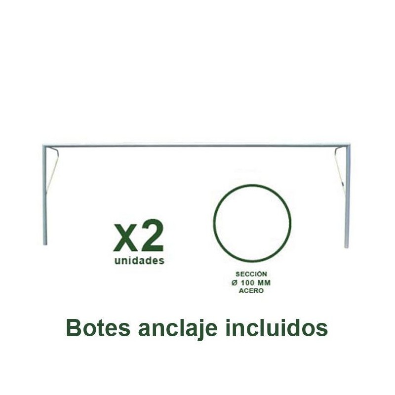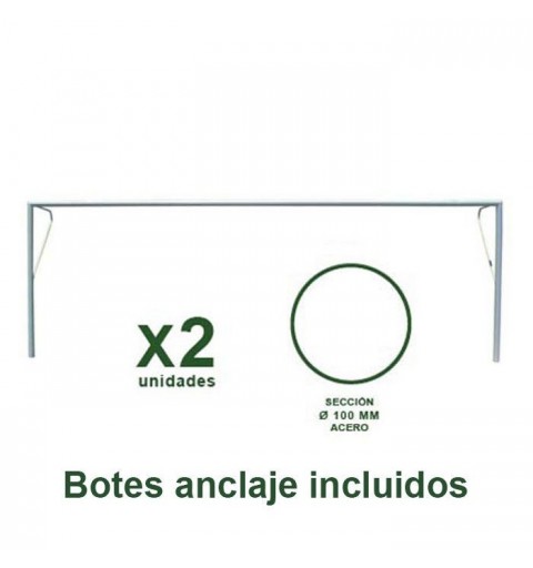 Juego de 2 porterías reglamentarias de fútbol 11 fijas fabricadas en acero de Ø 100 mm. Con botes de fijación incluidos.