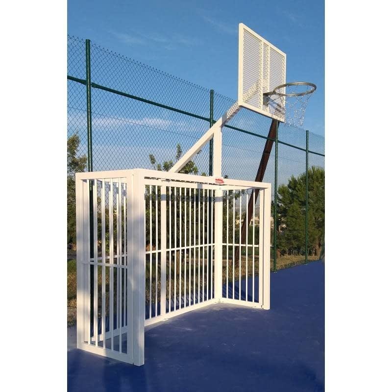 Juego de porterías de fútbol sala-balonmano antivandálicas con tableros y postes de baloncesto para áreas multijuego.