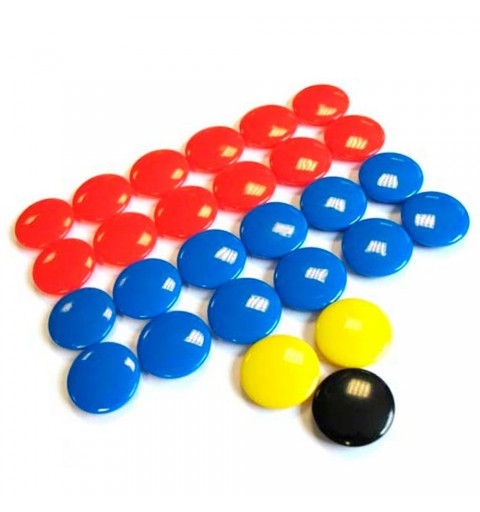 Cantidad: 12 fichas rojas, 12 azules, 2 amarillas y 1 negra