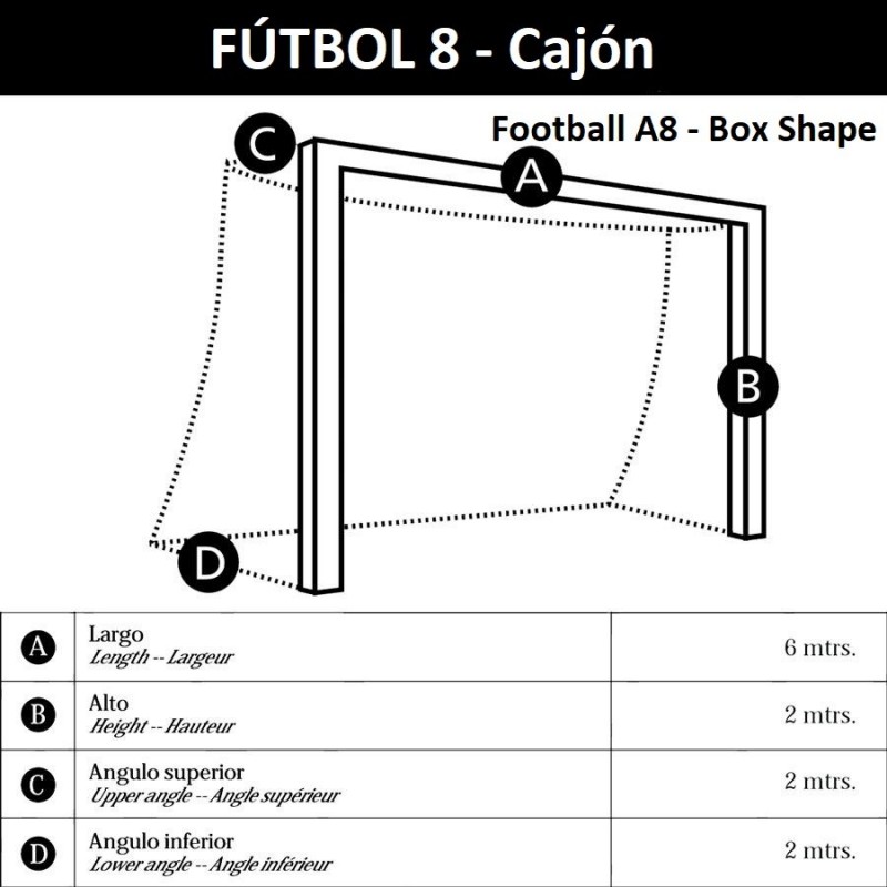 Su diseño está preparado para aquellas porterías de fútbol 8 que cumplen con medidas reglamentarias. Cuenta con una malla especial con medida 45 mm un tamaño menor que evita que se puedan meter los pies para intentar trepar la red. Su hilo de 5 mm proporciona máxima resistencia antes los actos vandálicos. La confección de esta red sigue los estándares marcados con la Real Federación Española de Fútbol y el Consejo Superior de Deportes.