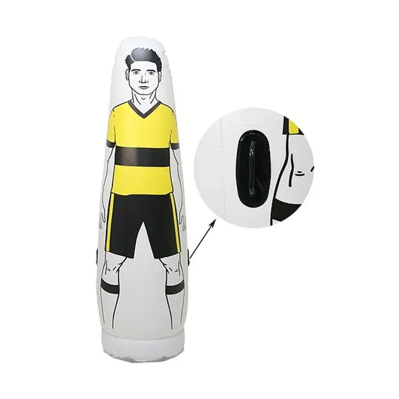 Este jugador de barrera inflable para entrenamientos de fútbol te permite crear ejercicios diferentes y eficaces. Haz uso de ellos como barrera, como jugador de campo rival y para los ejercicios para porteros creando situaciones reales de juego. Se puede usar en multitud de superficies y es fácil de transportar y guardar. Para que el jugador de barrera se utilice correctamente, debe llenarse la base de arena o de agua para darle mayor estabilidad.