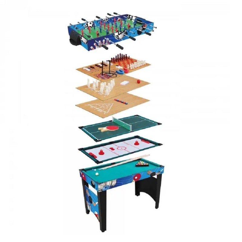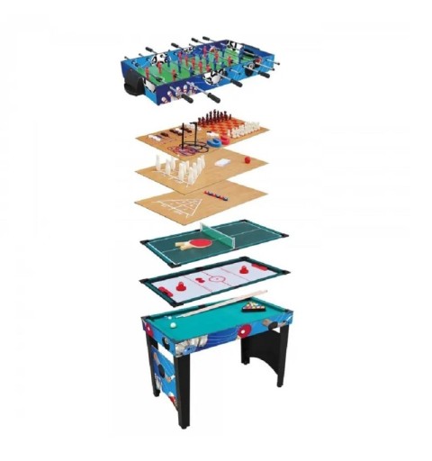 Disfruta de horas de diversión con 11 juegos diferentes en esta mesa multijuegos. Podrás jugar al futbolín, billar, air-hockey, blackjack, ajedrez, damas, back-gammon, tenis de mesa, tejo, bolos y lanzamiento de herradura. Fabricada en madera MDF de calidad, resistente y duradera, la mesa cuenta con tableros intercambiables fácilmente. Incluye todos los accesorios necesarios para comenzar a jugar. Uso doméstico.