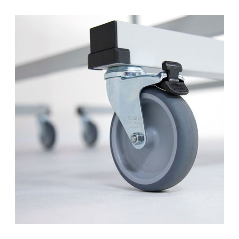 Para su transporte cómodo incorpora 8 ruedas, 4 de ellas en cada tablero, con un diámetro de 100mm, con banda de goma y realizadas con plástico duro. Cuenta con el sistema móvil roller, aplicado a los modelos de competición que permite desplazarla fácilmente. Las ruedas cuentan con sistema de freno (en dos de ellas) que evitan que la mesa se mueva durante el transcursos de los puntos.