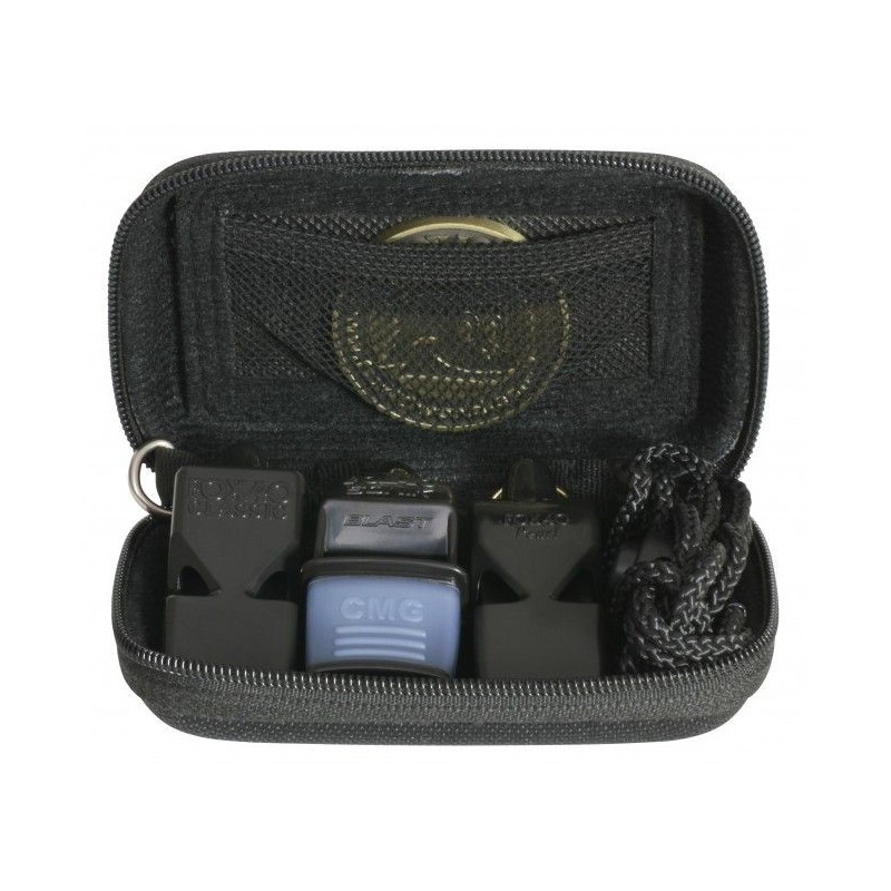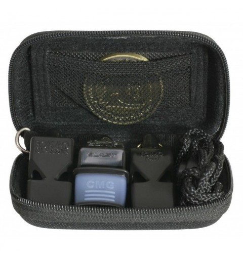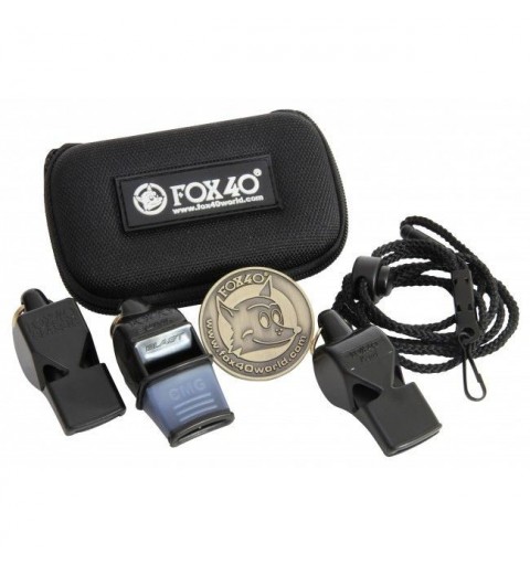 Pack de tres silbatos FOX 40 con un útil y resistente estuche para protegerlos y transportarlos. Además incluye una moneda de sorteo de campo y un cordón.