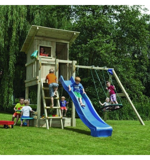 La Torre Beach Hut con columpio es un parque infantil completo que cuenta con una robusta torre de madera cuadrada. Los niños pueden acceder a ella subiendo por una escalera y descender por la rampa del tobogán. En la base, hay un arenero perfecto para construir castillos de arena a la sombra de la caseta. También incluye un columpio doble con dos asientos de plástico verde, añadiendo más diversión y aventura para los más pequeños. La caseta cuenta con un balcón con barandilla, una ventana y una puerta, ideales para inspirar cuentos e historias creativas. Fabricada con madera de alta calidad y tratada para exteriores, la estructura es duradera y sin grietas. El tobogán, hecho de HDPE, es resistente a la corrosión y puede permanecer al aire libre. En verano, se puede conectar una manguera para refrescar la rampa con agua, proporcionando aún más diversión. Recomendado para niños de 3 a 12 años y para uso doméstico.