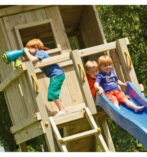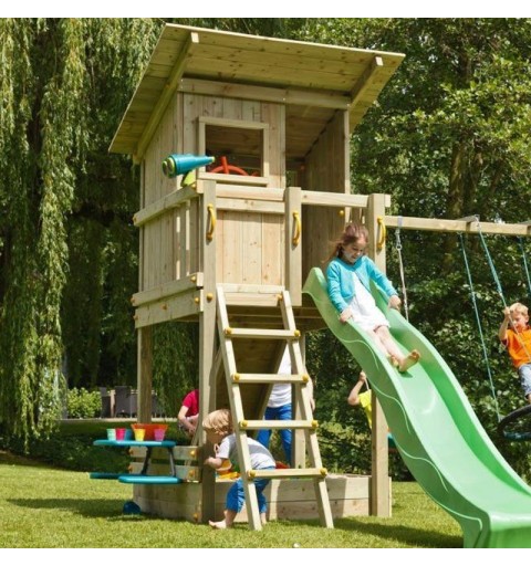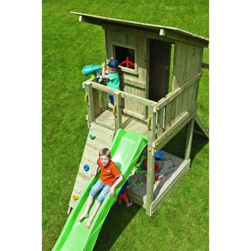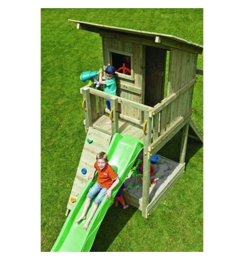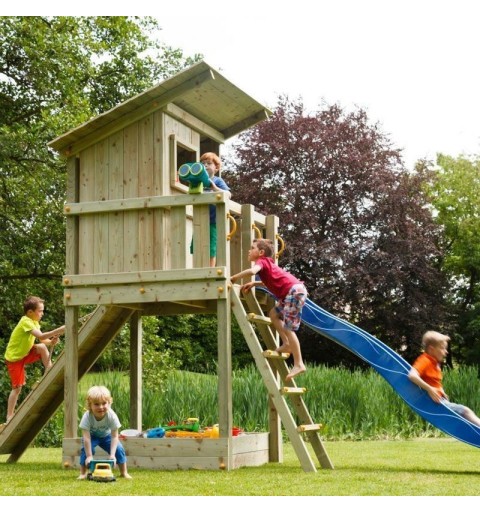 La Torre Beach Hut es una robusta torre de madera cuadrada que ofrece acceso mediante una escalera y un emocionante descenso por un tobogán. En la base, incluye un arenero ideal para que los niños construyan castillos de arena y jueguen a la sombra de la caseta. Esta caseta presenta un balcón con barandilla, una ventana y una puerta, perfectos para inspirar cuentos e historias creativas. Fabricada con madera de alta calidad, sin grietas y tratada para resistir condiciones exteriores, la estructura garantiza durabilidad. El tobogán, elaborado en HDPE, es resistente a la corrosión y apto para dejar al aire libre. En verano, se puede conectar una manguera para disfrutar de un refrescante chorro de agua en la rampa, proporcionando diversión adicional. Ideal para uso doméstico, se recomienda para niños de 3 a 12 años.