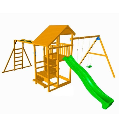El parque infantil cuenta con una casita de madera elevada, accesible a través de una escalera o una pared de escalada, y equipada con una rampa de tobogán para bajar. En su base, incluye un arenero ideal para crear castillos y figuras de arena, lo que amplía la diversión. También incorpora una mesa de picnic y permite añadir accesorios opcionales. Ahora, con un columpio doble, ofrece aún más actividades y entretenimiento. Esta torre alta y resistente está diseñada para niños de 3 a 12 años, soportando un peso máximo de 70 kg por usuario. El tobogán se puede conectar a una toma de agua o manguera, permitiendo que los niños se refresquen mientras juegan, perfecto para los días de verano. La rampa de escalada cuenta con cinco agarres para facilitar el acceso a la base, y el columpio incluye dos asientos de plástico verde para balancearse sin parar. Además, la escalera de mono ofrece más opciones de trepar y jugar para los más aventureros. El parque incluye un set de anclajes y córners para asegurar el columpio al suelo, garantizando estabilidad y seguridad. Fabricado con madera de alta calidad y tratada para exteriores, es perfecto para tener en el jardín sin preocuparte por el desgaste.