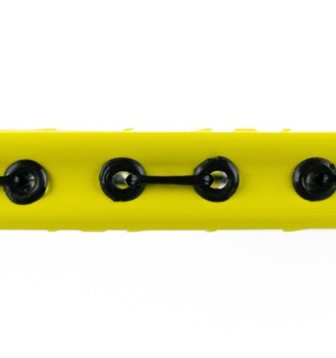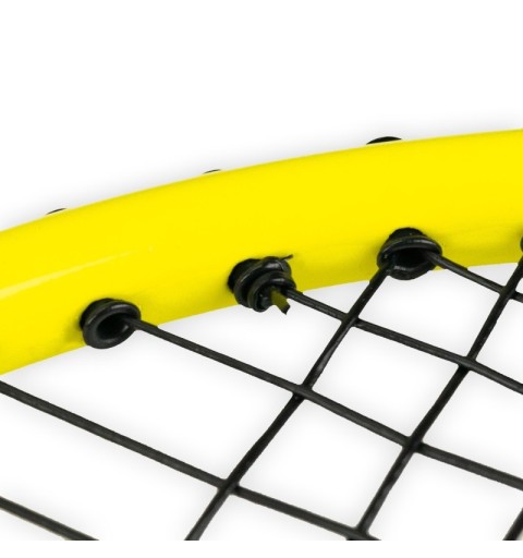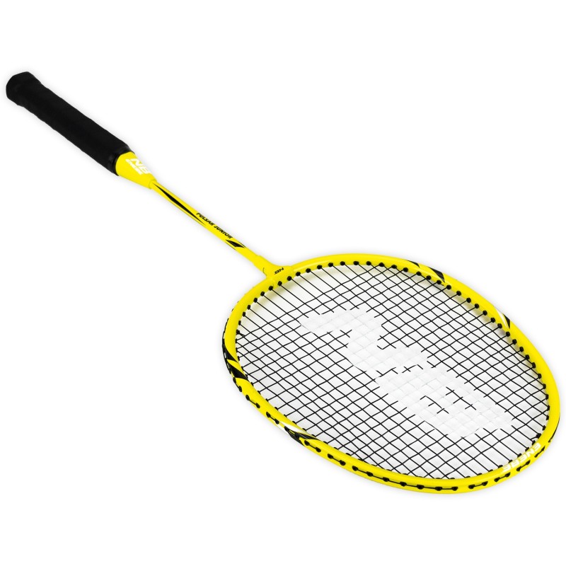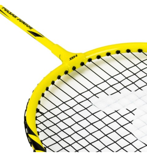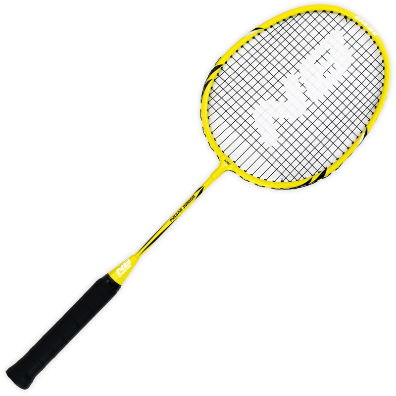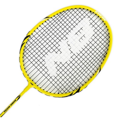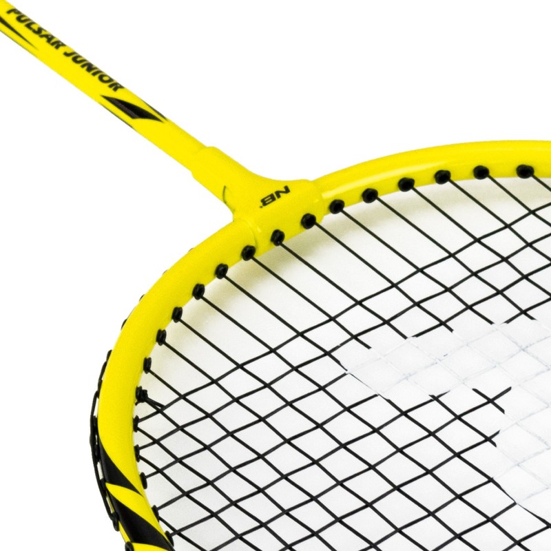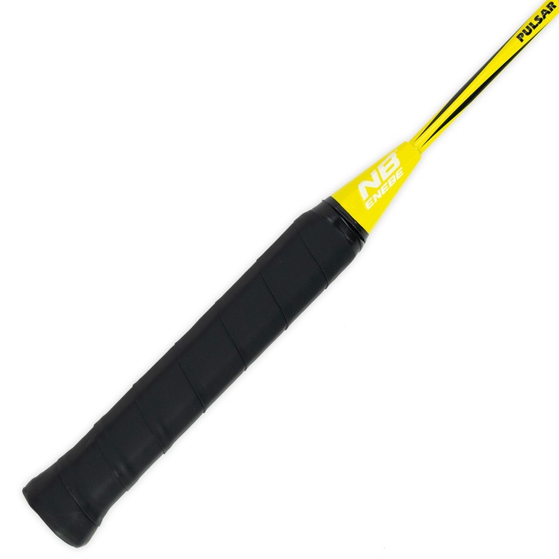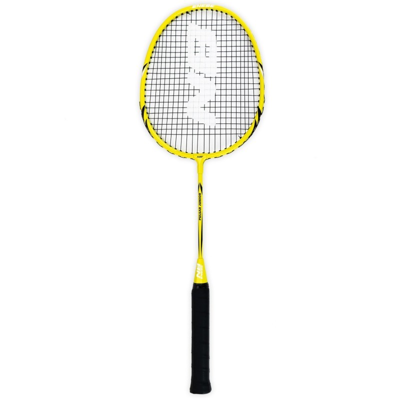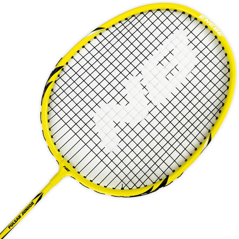 La raqueta Pulsar Jr de Enebe, en color amarillo, mide 60 cm de largo y 20 cm de ancho, diseñada para niños y adolescentes que desean iniciarse en el bádminton. Su mango cuenta con grip en relieve y amortiguado para un agarre óptimo, mientras que el cordaje tenso permite jugar cómodamente desde el primer día.