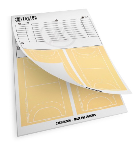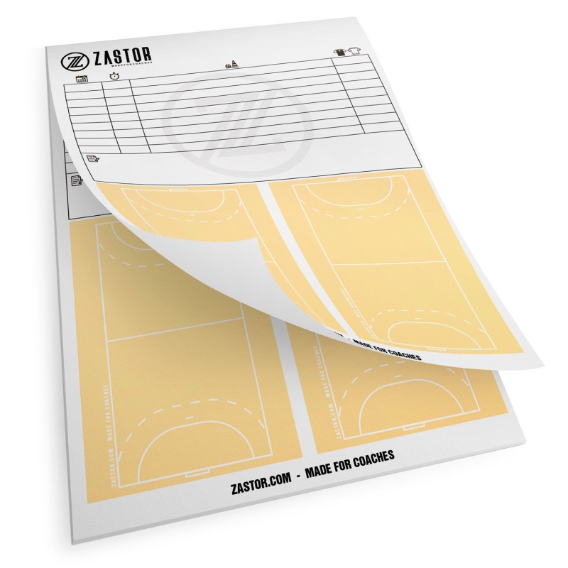 Explica jugadas y planes de entrenamiento con este recambio bloc de 25 hojas de fútbol sala o balonmano tamaño DIN A4 con dos dibujos del campo y zona de anotaciones.