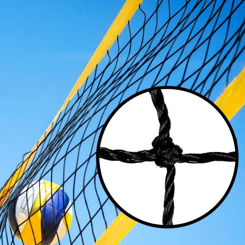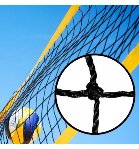Red de vóley playa Pro está fabricada en polipropileno 3 mm cableado negro de alta densidad torcido para postes de voleibol playa. Provista de cinta de color amarillo de 5 cm en todo su perímetro para identificar fácilmente todo su contorno incluso en condiciones de mucha luminosidad.